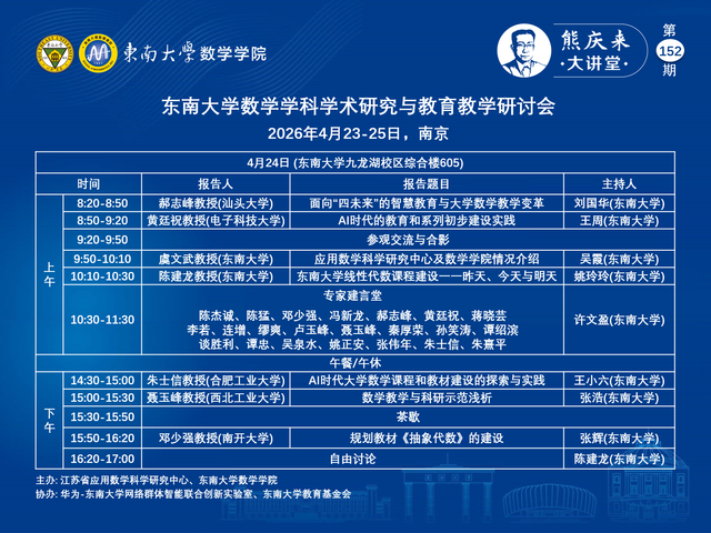 熊庆来大讲堂152期:2026.04.23 ~ 04. 25 - 色情平台 数学学科学术研究与教育教学研讨会